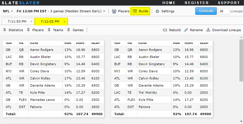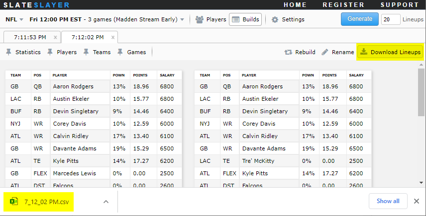 Lineups generated with the optimizer can be exported to a CSV format for DraftKings upload. The lineups in the exported CSV are slate-specific and will only be compatible for DraftKings contests of the same slate. Follow the steps below to download lineups in CSV format: